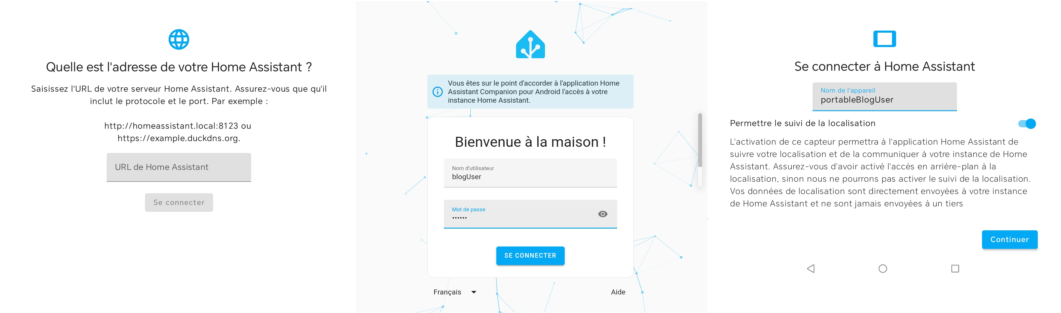 Nota : Une version de l’application Companion existe également pour les appareils Apple (iOS). N’étant pas familier de cet environnement, je ne peux pas détailler précisément sa configuration. Toutefois, les principes généraux restent similaires : connexion à l’instance Home Assistant via une adresse externe, authentification avec un utilisateur dédié, et autorisation de la géolocalisation afin de permettre les automatisations basées sur la position.