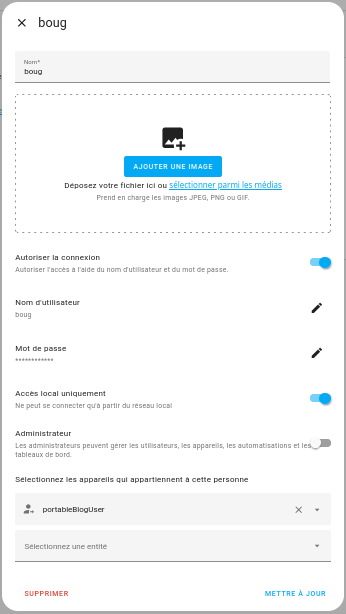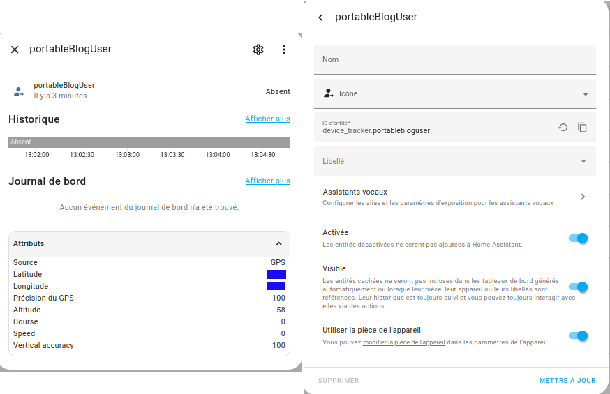 Une fois ces étapes terminées et validées, une entité de type device_tracker devrait apparaître automatiquement dans Home Assistant (dans mon exemple device_tracker.portableBlogUser)