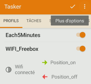 - Les Profils : ils définissent les conditions ou déclencheurs (ex. changement de position, niveau de batterie, heure, connexion à un WIFI particulier, etc.). Il peuvent être actifs ou inactifs.