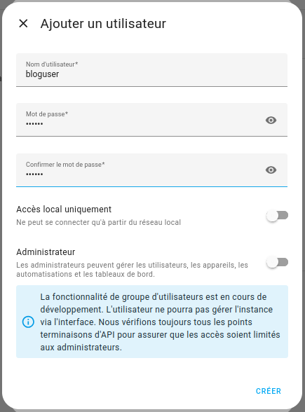 Cette création se fait via le menu Paramètres > Personnes dans Home Assistant. L’utilisateur ainsi créé devra disposer des droits nécessaires pour se connecter à l’instance